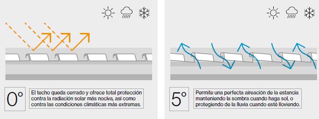 Permite una perfecta aireación de la estancia, manteniendo la sombra cuando haga sol o protegiendo de la lluvia cuando esté lloviendo