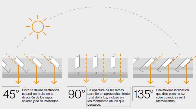 - Este sistema permite ajustar la orientación de las lamas para regular la cantidad de luz, sombra y ventilación que se desea en el espacio. Las lamas pueden girar hasta 140 grados, permitiendo un control preciso sobre el clima y la temperatura en el área.