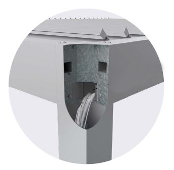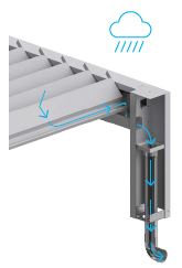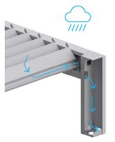 La canalización integrada en su interior permite evacuar el agua de lluvia para su posterior recuperación. Durante la obra de la solera previa a la colocación de la pérgola, habrá que tener en cuenta la preinstalación de las tuberías de desagüe.